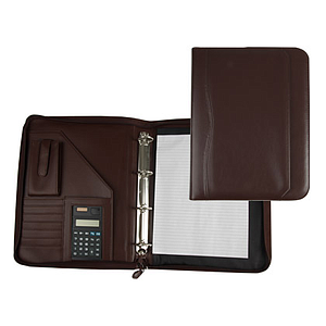 ARTESANIA - CARPETA PORTAFOLIOS MARRON 260X355 MM CREMALLERA 4 ANILLAS 40 MM CALCULADORA CON BOLSA PARA MOVIL (Ref.45-848)